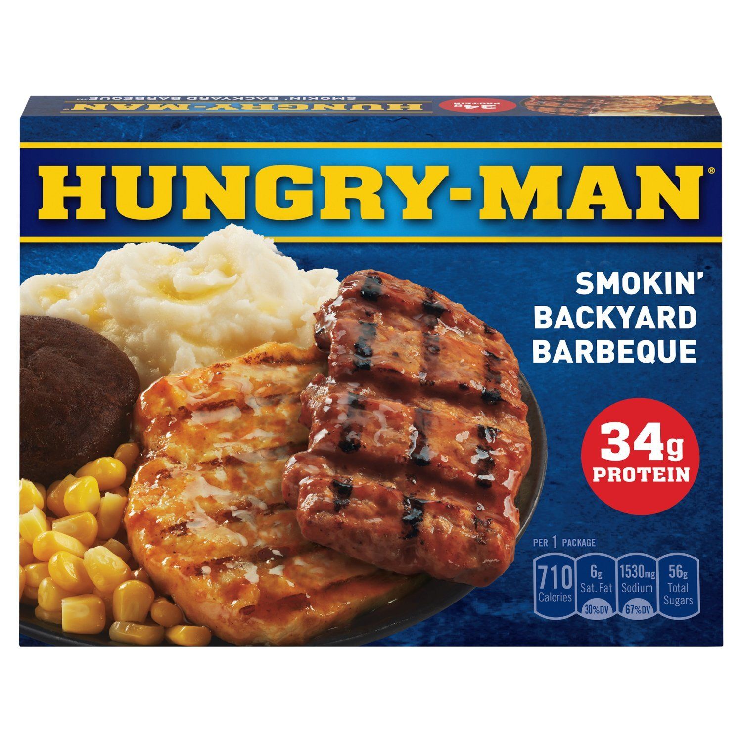 Enjoy classic home-style flavors and satisfy your comfort food cravings with Hungry-Man Smokin' Backyard Barbeque. Dig into an easy-to-prepare frozen meal featuring a grilled glazed chicken patty and a rib-shaped pork patty in a smoky chipotle barbeque sauce, home-style mashed potatoes and sweet corn side dishes, and a rich chocolate brownie dessert. With 34 grams of protein per serving, this frozen food offers a home-style recipe for satisfying frozen entrees that are ready to eat anytime hunger strikes. Whether you're looking for convenient lunches to bring to work, a hearty TV dinner or easy meals that are ready to eat in minutes, Hungry-Man microwave meals are a great choice to tackle those tummy rumbles. Each package contains one full meal that is perfect for busy lifestyles and hearty appetites. Store the convenient frozen meals in your freezer until you're ready to enjoy. Try other Hungry-Man frozen meals to find your favorite. Hungry-Man offers big portions for big appetites.