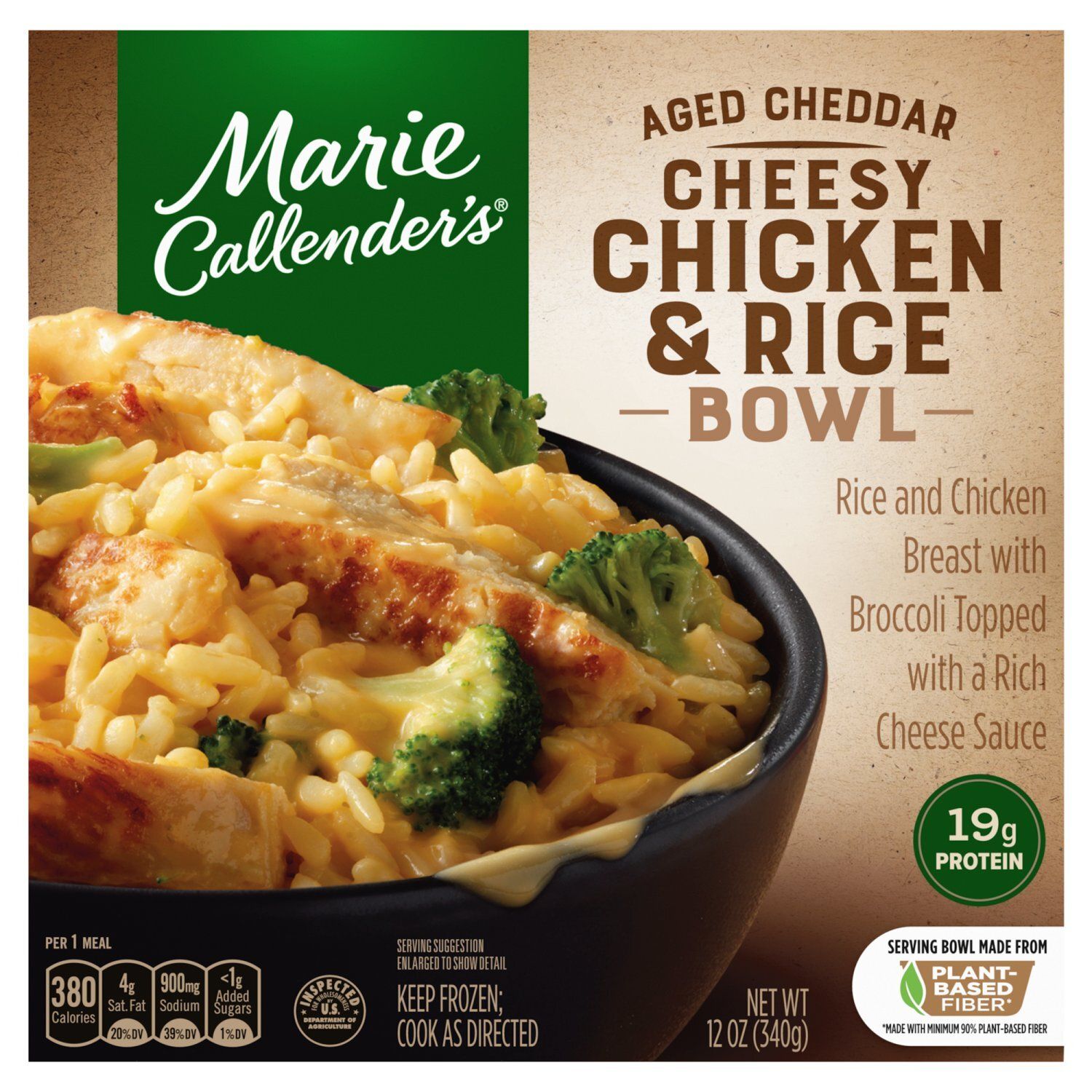 Put the taste of homestyle flavor on your table with Marie Callender's Aged Cheddar Cheesy Chicken and Rice Bowl. Enjoy delicious rice and premium chicken breast with broccoli florets topped with a rich and creamy aged cheddar cheese sauce for an irresistible frozen meal that everyone is sure to love. This comforting microwavable meal comes in a serving bowl made from plant-based fiber and contains 19 grams of protein per serving with no preservatives and no artificial flavors or colors. Easily prepare this tasty cheesy chicken and rice bowl for quick office lunches or effortless frozen dinners with convenient microwave or oven preparation. Enjoy warm, hearty ingredients and delicious homemade comfort food taste with Marie Callender's.