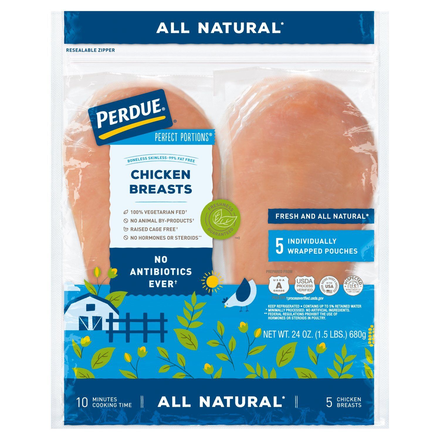 Raised right in America - PERDUE® PERFECT PORTIONS® Boneless, Skinless Chicken Breasts are a popular kitchen staple you can feel great about feeding your family. Chicken Breasts are individually-wrapped to cook what you need and refrigerate or freeze the rest for later. They are perfectly sized to cook quickly and evenly in 10 minutes. These chicken breasts work great for a weeknight sandwich, salad, or sheet tray dinner!